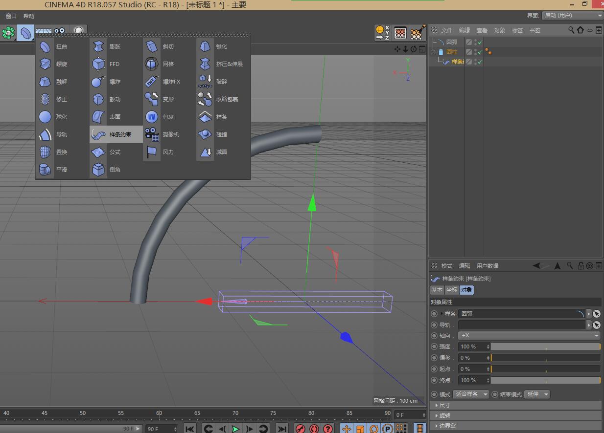 然后选择变形工具里面的“样条约束”,将它放置在圆柱体子集下,