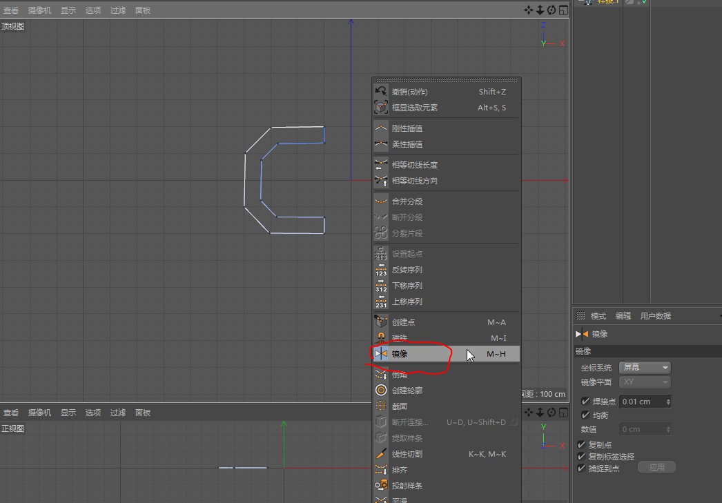 同样,选择样条,在选择工具下右键--镜像(m~h)