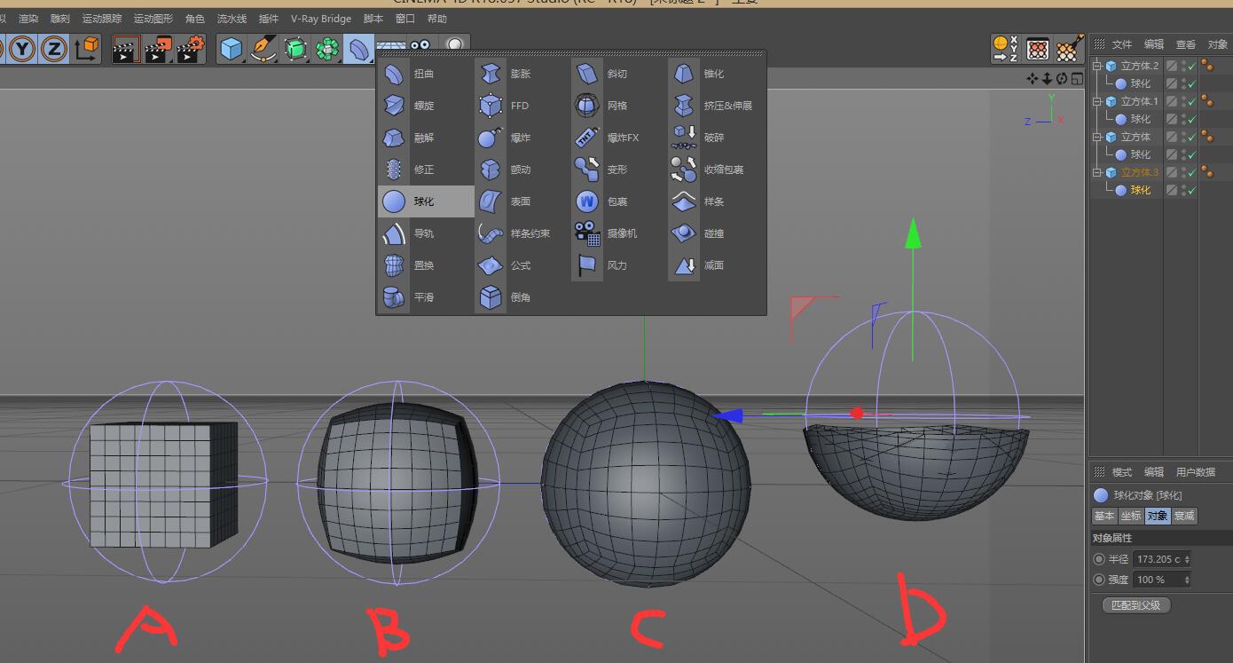 CINEMA 4D入门 (75):C4D变形工具组 - 球化工具 建模图文 2017-10-26 9:41:07 次浏览 个赞 23评论 已收录 Mr.R 取消关注 关注 私信 球化工具,也就是让物体变为球体,添加球化工具到物体子层级,调节强度即可。 上图是 4 个立方体,添加球化的不同效果。 A 强度为 0,B 强度为 50,C 强度为 100,D 修改球化工具的坐标轴。