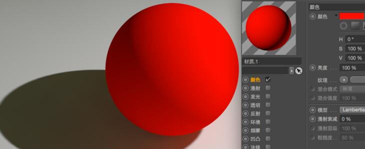 2、如果再勾选漫射通道,为其添加一个噪波贴图(SHADE 程序贴图)。渲染器先计算颜色通道为红色,后计算漫射通道的噪波,显示的结果是后者影响了颜色通道红色的显示,你也可以简单理解这是一种层与层之间的混合覆盖。