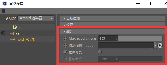 “渲染设置”(Render Settings)的“Arnold 渲染器”(Arnold Renderer)选项卡中的“细分”(Subdivision)部分的“切割用摄影机”(Dicing Camera)菜单。