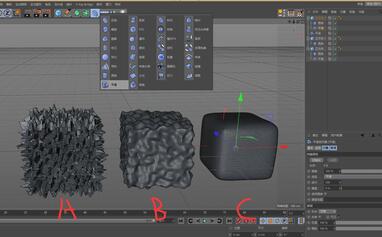 平滑工具,在我们做造型的时候,用的并不多,但是这里还是噱微的讲解一下, 上图 A 是我们上一节学过的置换工具,添加燥波所做出的效果。 B 是在 A 的基础上添加平滑,并调节硬度、强度、迭代等参数,这里需要注意一下平滑工具在对象面板的层级位置。 平滑工具同样置于立方体的子层级,同时在置换之后,也就是先置换,再平滑。 通过上图中的 C 我们加大平滑的迭代,可以看到物体表面的置