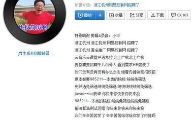 还记得那个悲催的江南皮革厂老板黄鹤吗?近几年他可谓是火遍了大江南北。 日前,网易为了招聘,就仿照黄鹤的段子,编造了一段神曲,洗脑效果非常好,有兴趣的不妨听一听。 这年头,招聘不玩点花样也是不行... 试听: http://music.163.com/#/song?id=421885610&market=zhaopin -