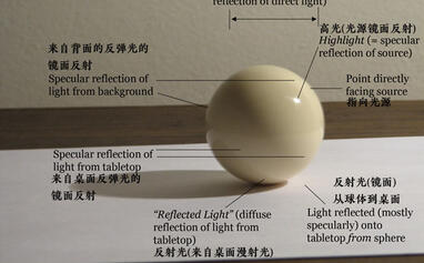 【R站译制】CG&VFX《光影着色基础》BASICS OF LIGHT AND SHADE 强烈推荐镜面反射和漫反射 一个光泽度的球体(台球),在单个直接光源下,所展示的镜面和漫反射效果。摄影:David Briggs 这两个反射过程,在大多数表面上几乎同时进行,它们被称为镜面(或表面 surface)反射和漫(或主体 body)反射。镜面反射(顾名思义"镜面"),最明显的区别是它会创建高光,上图中,在球球上,就像大多数物质一样,除了铜、金等有色金属,镜面反射保留了(白色)光源的颜色,漫反射则